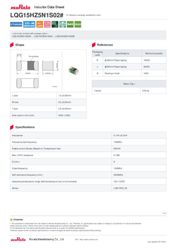 LQG15HZ5N1S02D Ind RF Chip Molded Multi-Layer 5.1nH 0.3nH 100MHz 8Q-Factor 650mA 0402 Pape...