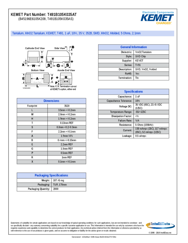 T491B105K035AT Cap Tant Solid 1uF 35V B CASE 10% (3.5 X 2.8 X 1.9mm) SMD 3528-21 T/R