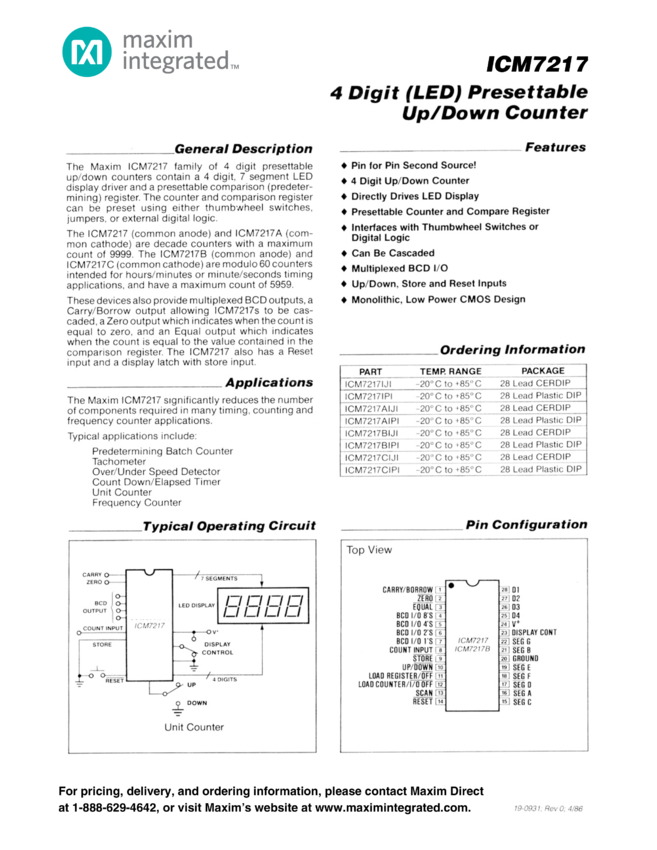 ICM7217B ICM7217, ICM7217A, ICM7217B, ICM7217C 4-Digit, Presettable, LED Up/Down Cou...