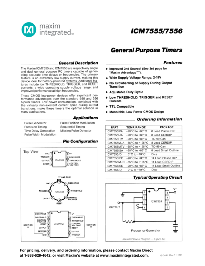 ICM7555, ICM7556 Low-Power, General-Purpose Timer