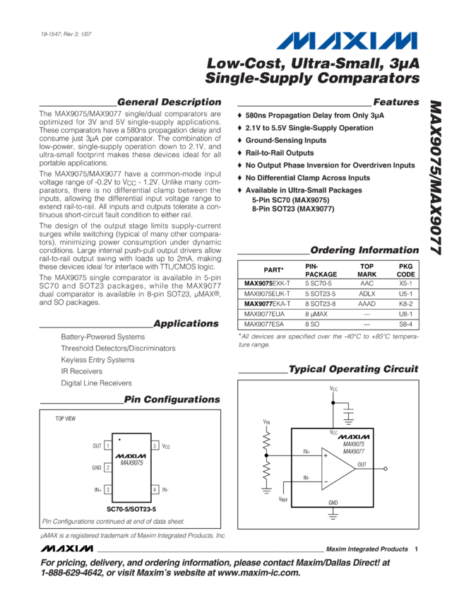 MAX9075 MAX9075, MAX9077 Low-Cost, Ultra-Small, 3µA Single-Supply Comparators