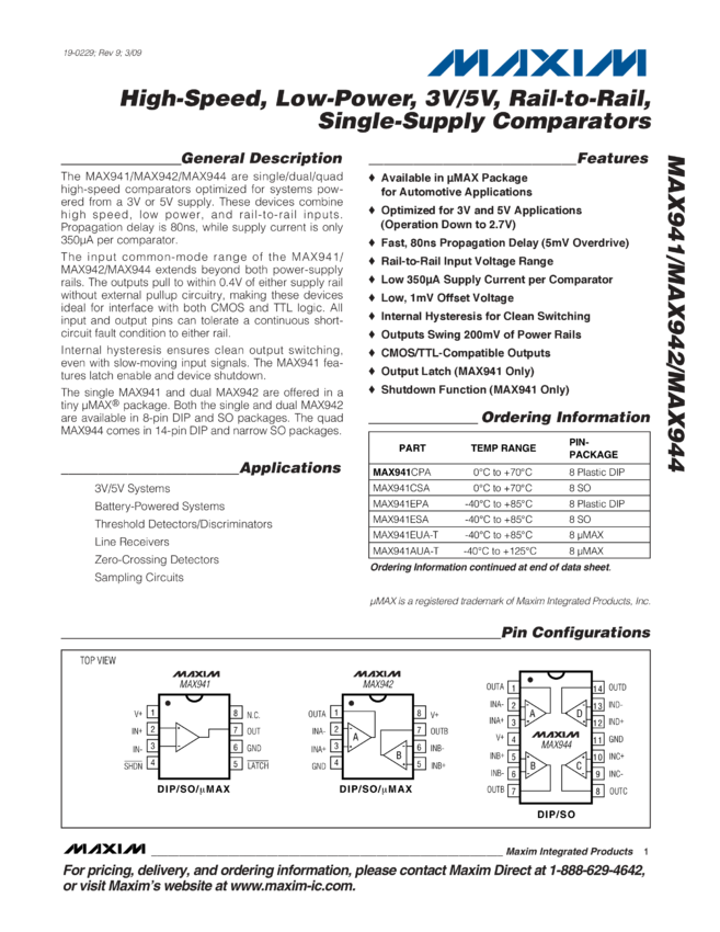 MAX941, MAX942, MAX944 High-Speed, Low-Power, 3V/5V, Rail-to-Rail, Single-Supply Comparators