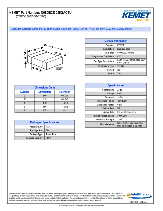 C0805C270J5GAC7800 Cap Ceramic 27pF 50V C0G 5% SMD 0805 125°C Paper T/R