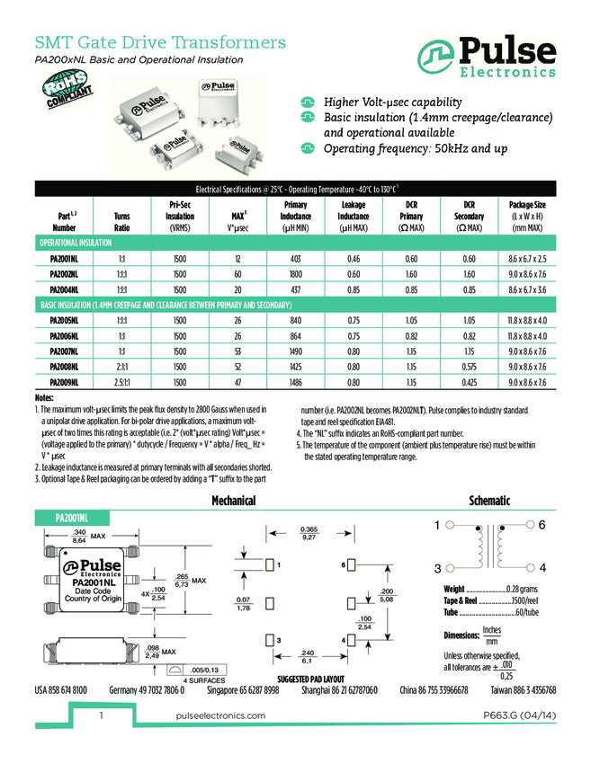 PA2006NLT Pulse Transformer 1:1 1500Vrms 0.82Ohm Prim. DCR 0.82Ohm Sec. DCR 28Vus Sur...
