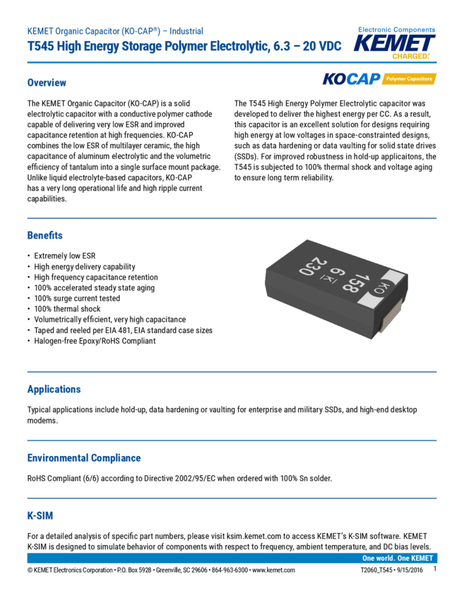 T545H187M016ATE055 Cap Tant Solid 180uF 16V H CASE 20% (7.3 X 6 X 1.9mm) SMD 7360-20 0.055 Ohm...