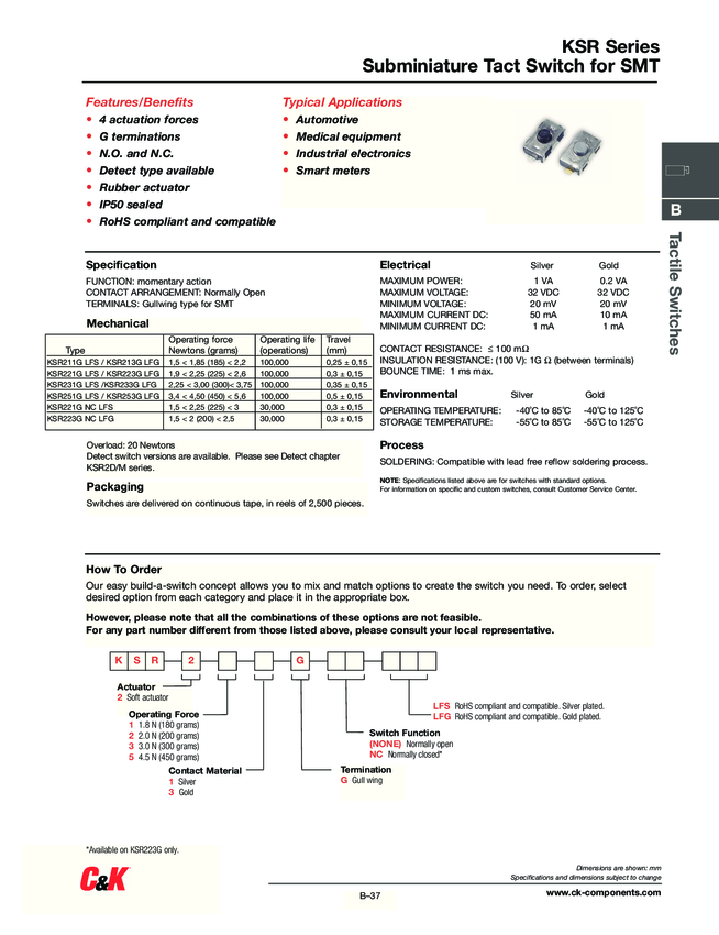 KSR211GLFS Switch Tactile N.O. SPST Round Button Gull Wing 0.05A 32VDC 1VA 100000Cycle...