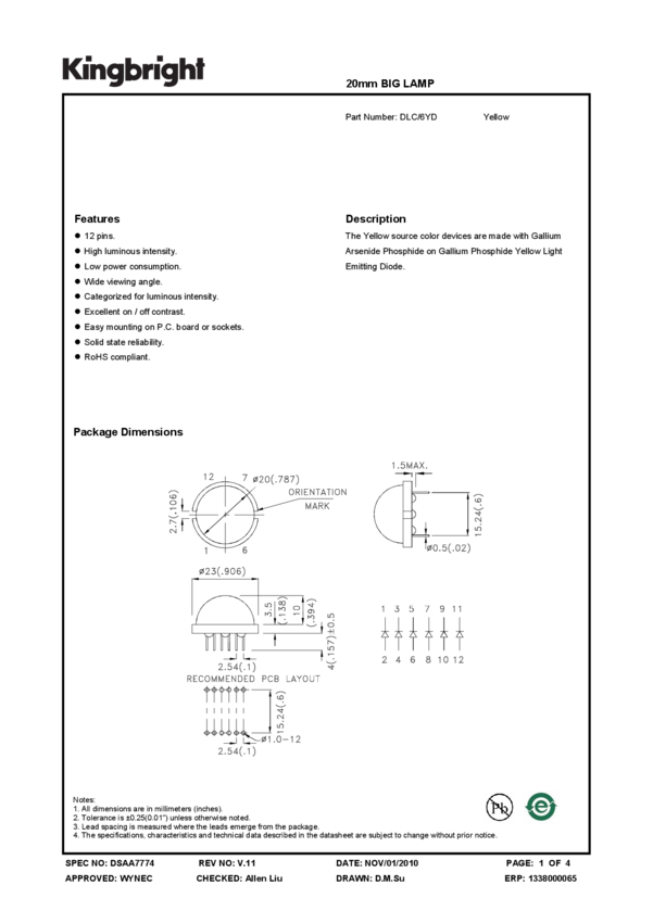 DLC/6YD LED Uni-Color Yellow 590nm Standard LED 12-Pin Tube