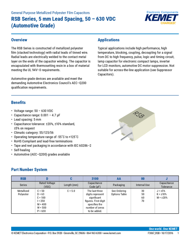 RSBMC2470AA00K Cap Film 0.047uF 400VDC/200VAC PET 10% 7.2 X 6 X 11mm RDL 5mm Bulk