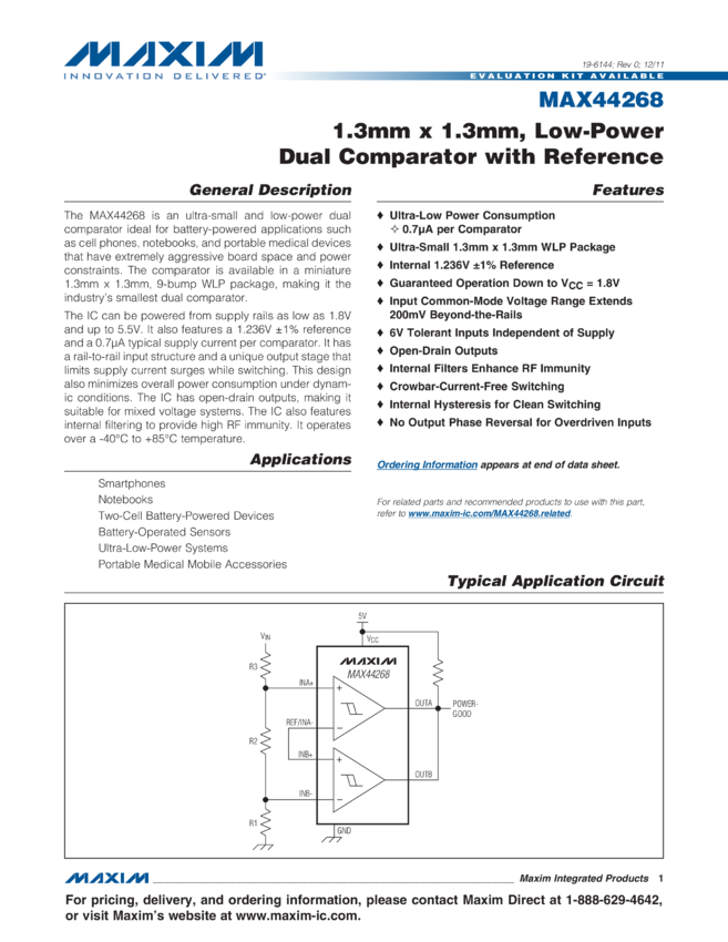 MAX44268 1.3mm x 1.3mm, Low-Power Dual Comparator with Reference