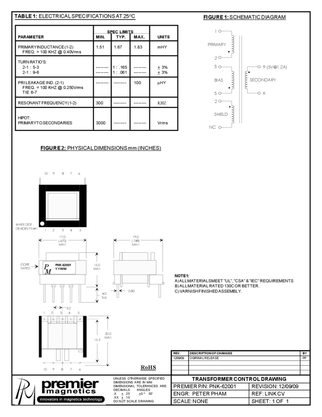 PNK-62001 Power Transformer 1:0.165:1:0.061 Single+Auxilary Prim. Single Sec. 5V Sec....