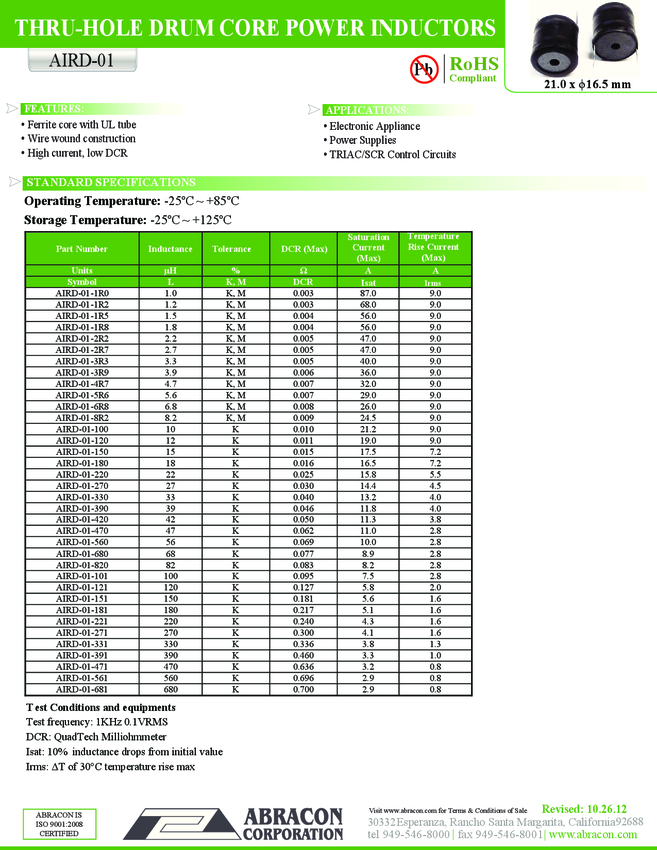 AIRD-01-221K Ind Power 220uH 10% 1KHz Ferrite 1.6A Radial Bulk
