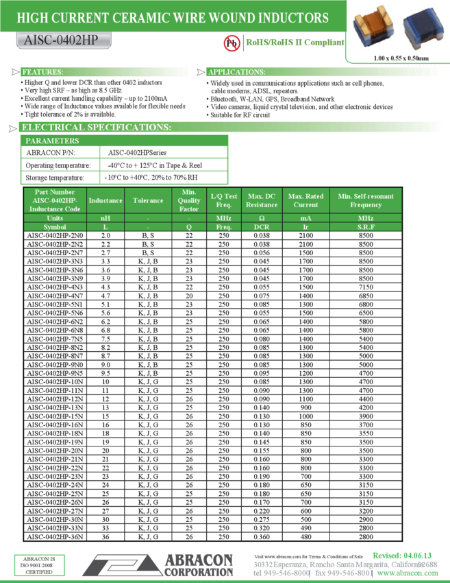 AISC-0402HP-8N2J-T, AISC-0402HP-3N9J-T, AISC-0402HP-56NJ-T, AISC-0402HP-18NJ-T