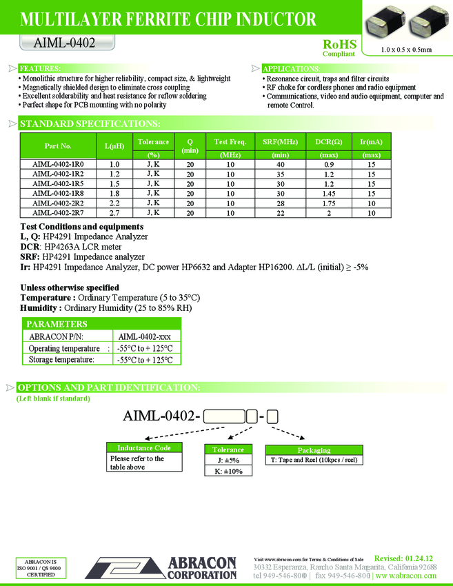 AIML-0402-2R7K-T Ind Chip Shielded Multi-Layer 2.7uH 10% 10MHz 20Q-Factor Ferrite 10mA 0402...