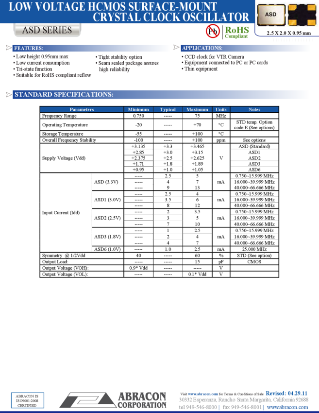 ASD1-12.000MHZ-EC-T, ASD1-25.000MHZ-EC-T, ASD-48.000MHZ-LC-T, ASD-20.000MHZ-LC-T