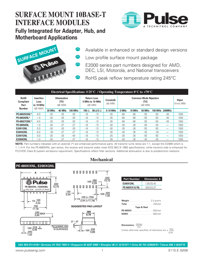 E2007QNL Telecom Transformer 1:1.41 1500Vrms -1dB Surface Mount