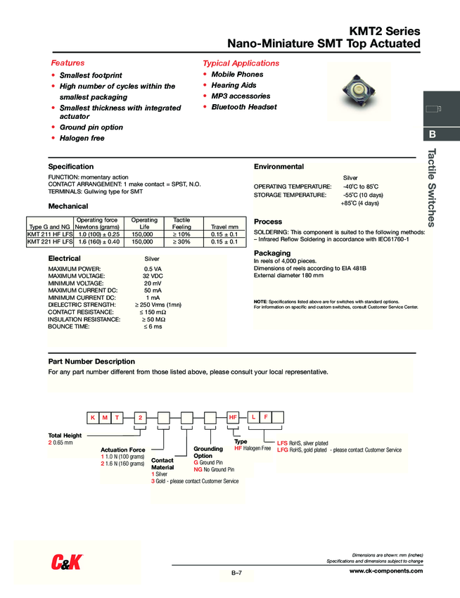 KMT221NGHFLFS Switch Tactile N.O. SPST Flat Button Gull Wing 0.05A 32VDC 0.5VA 150000Cycl...