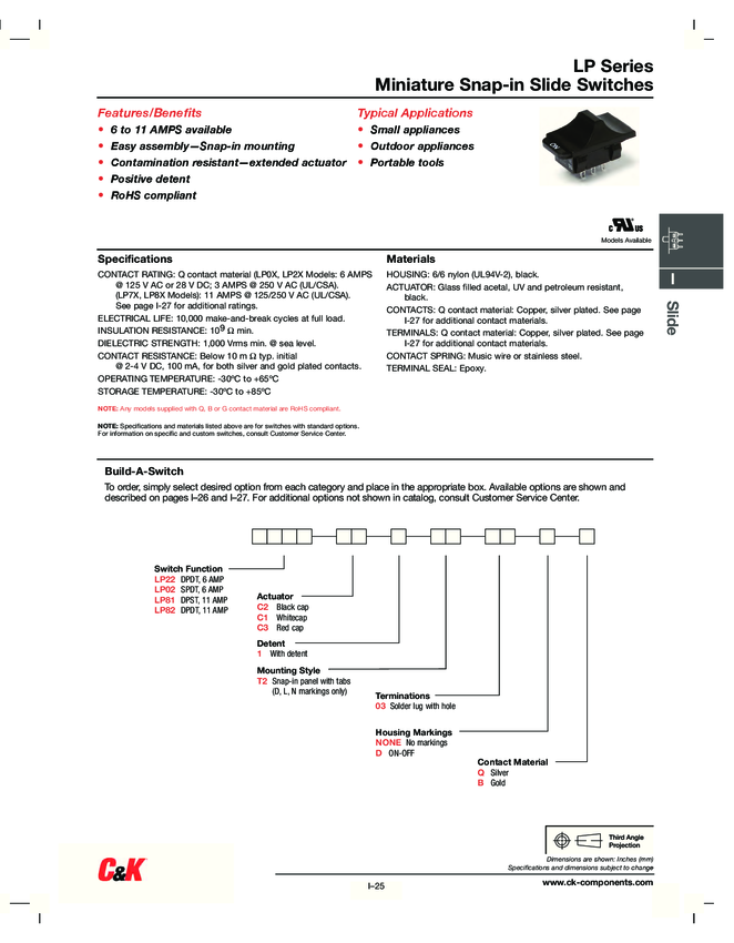 LP02C31T203DQ Switch Slide DPDT Extended Top Slide 6A 250VAC 28VDC Solder Lug Panel Mount