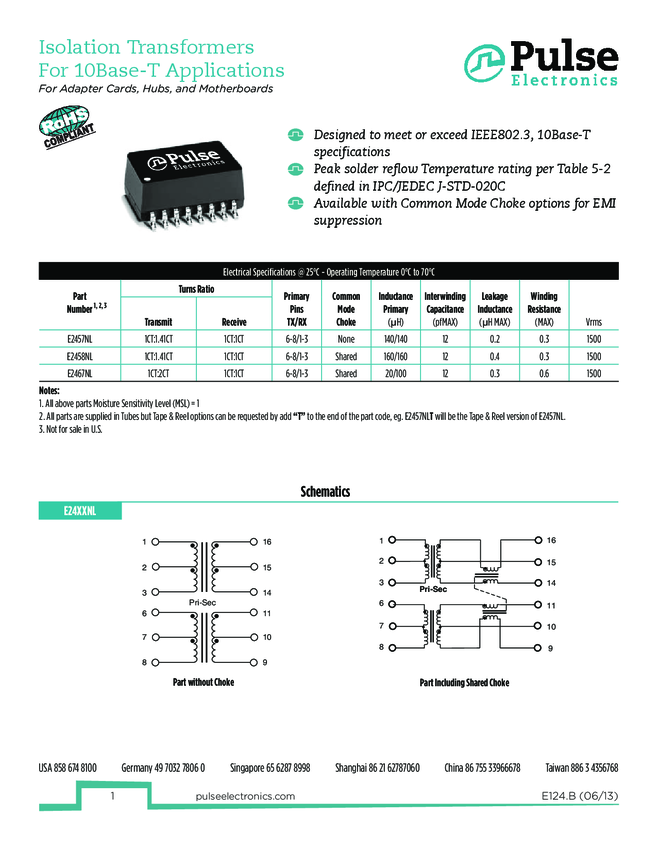 E2457NLT Telecom Transformer 1:1.41/1:1 1500Vrms Surface Mount