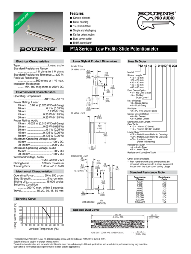 PTA3043-2010CIB103 Res Carbon Film POT 10K Ohm 20% 1/4W (60 X 9 X 24.5mm) Pin Thru-Hole