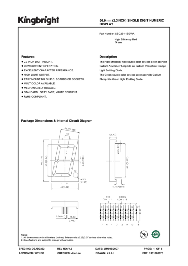 SBC23-11EGWA Displays Segmented Panel 1DIGIT 60LED Green/Red 10-Pin DIP Tube