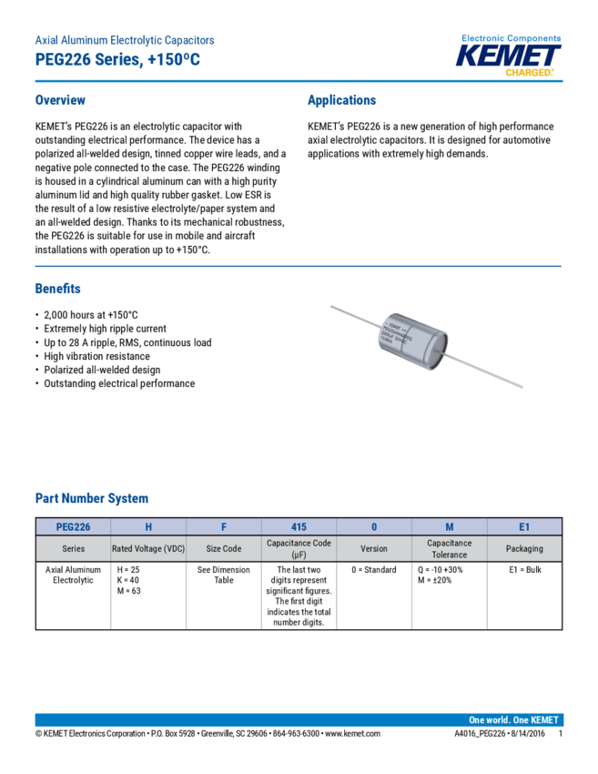 PEG226KF3800QE1 Cap Aluminum 800uF 40V -10% to 30% (16 X 29mm) Axial 0.1 Ohm 4600mA 1500 hr...