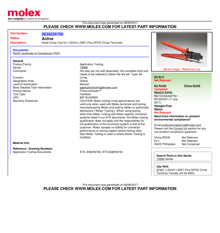 638259700 Hand Crimp Tool For 1.50mm (.059-Inch) Pico-SPOX Crimp Terminals