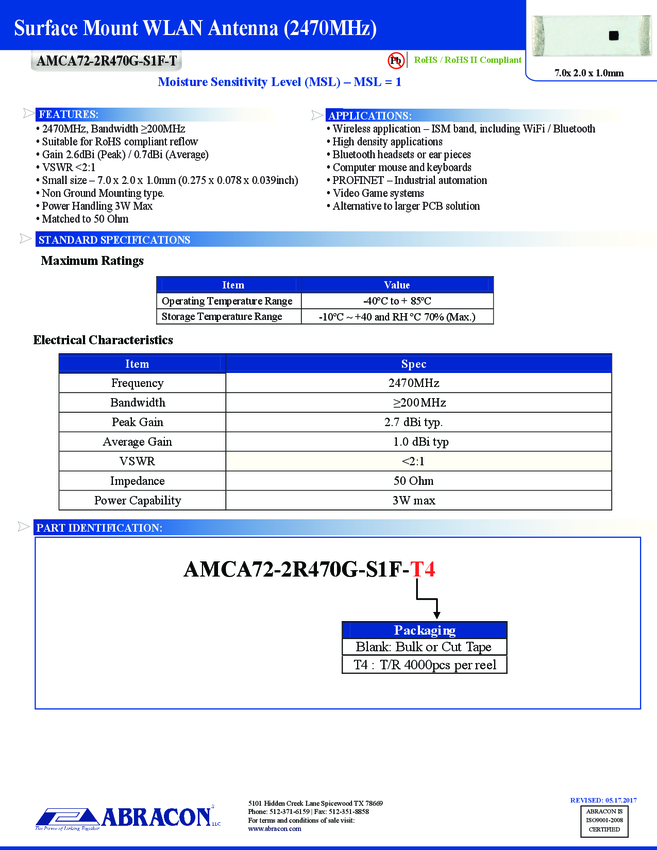 AMCA72-2R470G-S1F-T4 Antenna Chip 1dBi 2470MHz 2-Pin SMD T/R