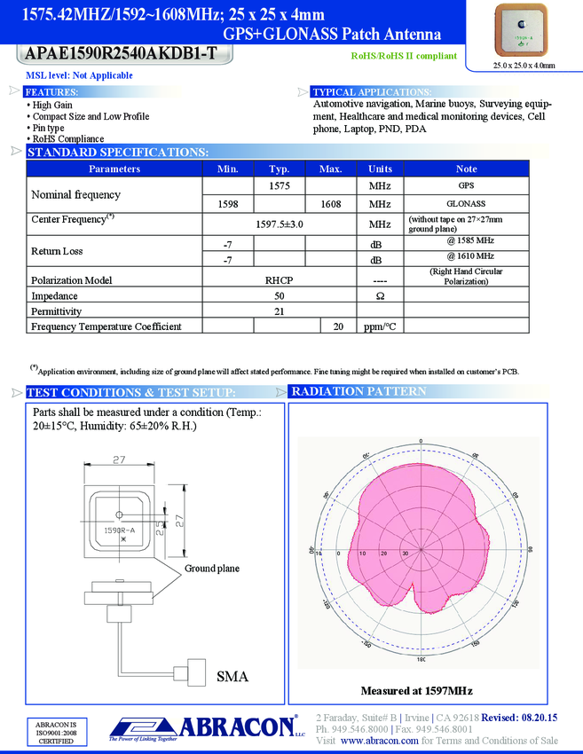 APAE1590R2540AKDB1-T Antenna Patch GPS+GLONASS 1608MHz T/R