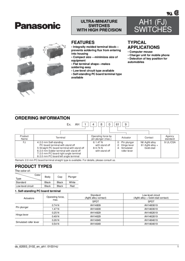 AH14809AT Switch Snap Action N.O./N.C. SPDT Pin Plunger PC Pins 1A 125VAC 30VDC 0.74N...
