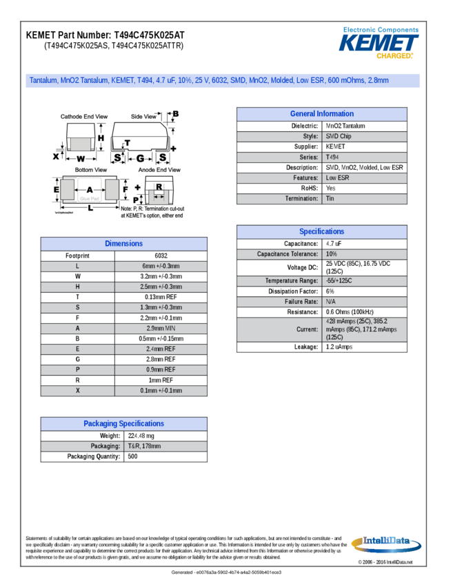 T494C475K025AT Cap Tant Solid 4.7uF 25V C CASE 10% (6 X 3.2 X 2.5mm) SMD 6032-28 0.6 Ohm 1...