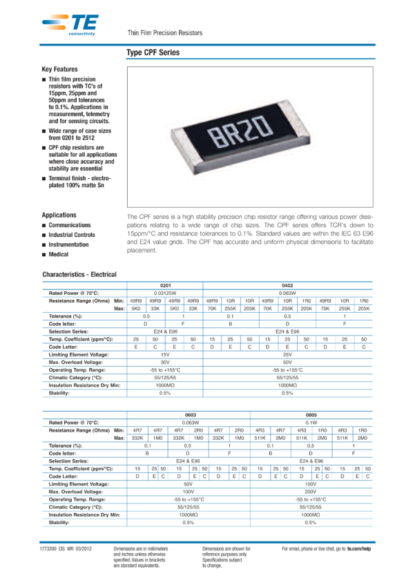 - CPF0603F9K76C1, CPF0603F25R5C1, CPF0603F100KC1, CPF0805B16K9E1, CPF0603F215RC1, CPF0603F11KC1, CPF0603F4K32C1, CPF0603F2K49C1, CPF0603F5K9C1, CPF0603F20RC1, CPF0603F16K2C1, CPF0603F4K53C1, CPF0603F6R04C1, CPF0603F7K15C1, CPF0603F37R4C1, CPF0603B13KE1, CPF0603B62RE1, CPF0603F73K2C1, CPF0603F10KC1, CPF1206B174KE1, CPF1206B174RE1, CPF1206B274KE1, CPF1206B274RE1, CPF1206B27K4E1, CPF1206B28R7E1, CPF1206B432RE1, CPF1206B41R2E1, CPF1206B43K2E1, CPF1206B422KE1, CPF1206B7K15E1