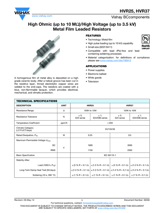 HVR3700001204FA100 Res Metal Film 1.2M Ohm 1% 1/2W ±200ppm/°C Conformal Axial Thru-Hole Ammo P...