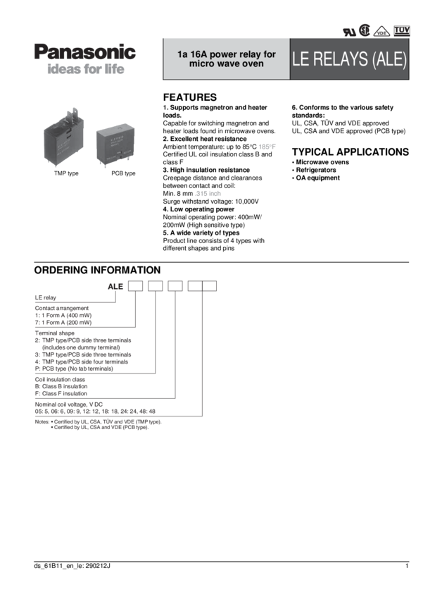 ALE1PB12 Electromechanical Relay SPST-NO 16A 12VDC 720Ohm Through Hole