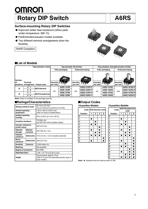 A6RS-162RF-P Switch DIP SP10T 10 Flush Screwdriver 0.025A 24VDC Gull Wing 2.54mm SMD Emb...