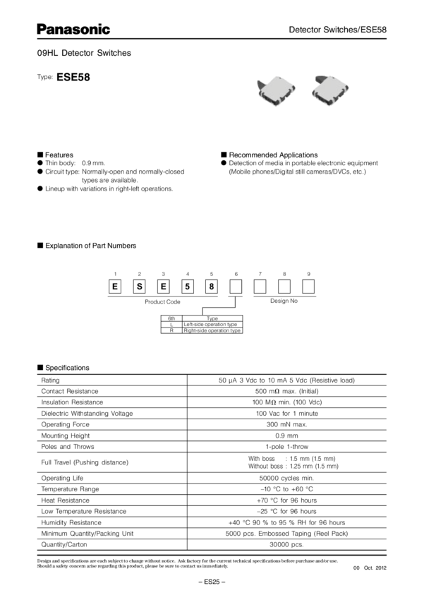 ESE58R11B Electromechanical Switch Detect Switch N.O. SPST 0.01A 5VDC Embossed T/R