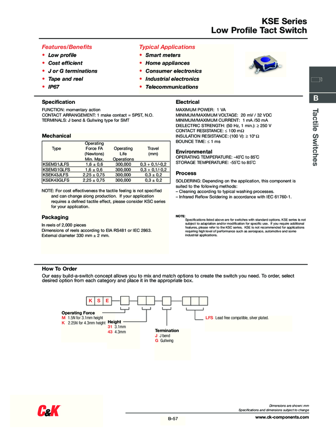 KSEK43G LFS Switch Tactile N.O. SPST Round Button Gull Wing 0.05A 32VDC 300000Cycle 2.2...