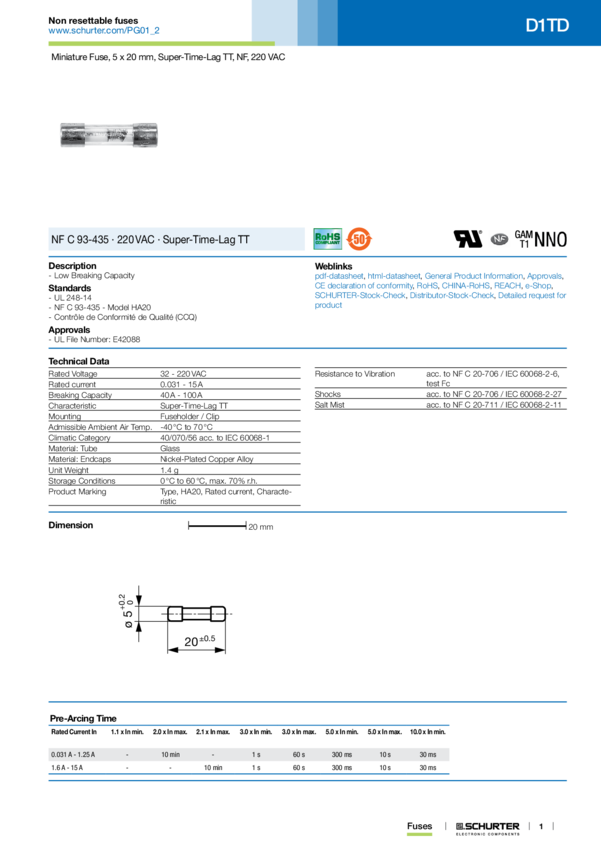 7030.3310 Fuse Miniature 0.8A 220V Super Time Lag 2-Pin Bulk