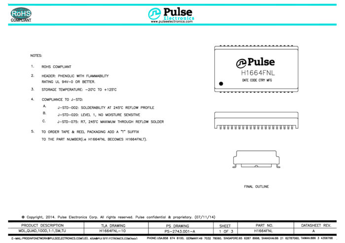 H1664FNLT Telecom Transformer 1:1/1:1 1500Vrms -1.2dB Surface Mount