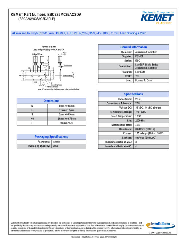 ESC226M035AC3DA Cap Aluminum 22uF 35V 20% (5 X 11mm) Radial 5mm 95mA 2000 hr 105°C Ammo Pac...