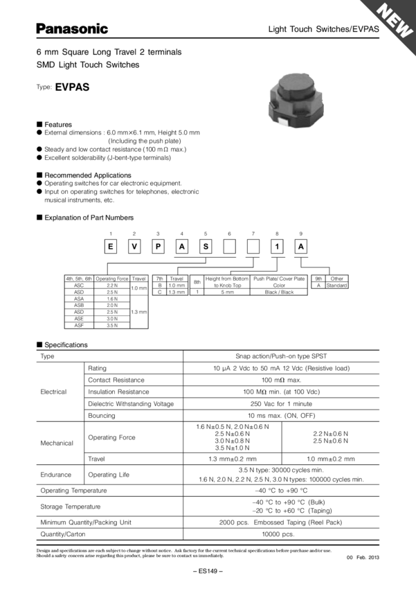 EVPASBC1A Switch Tactile N.O. SPST Round Button J-Bend 0.05A 12V DC 100000Cycle 2N SM...