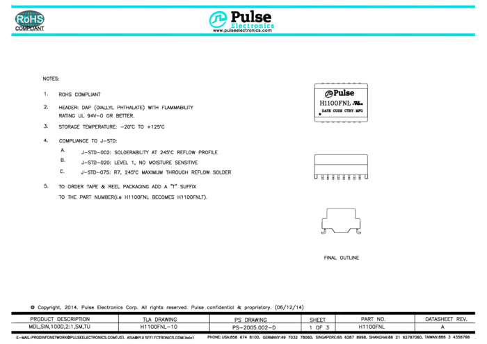 H1100FNL Telecom Transformer 2:1/1:1 1500Vrms -1.2dB Surface Mount