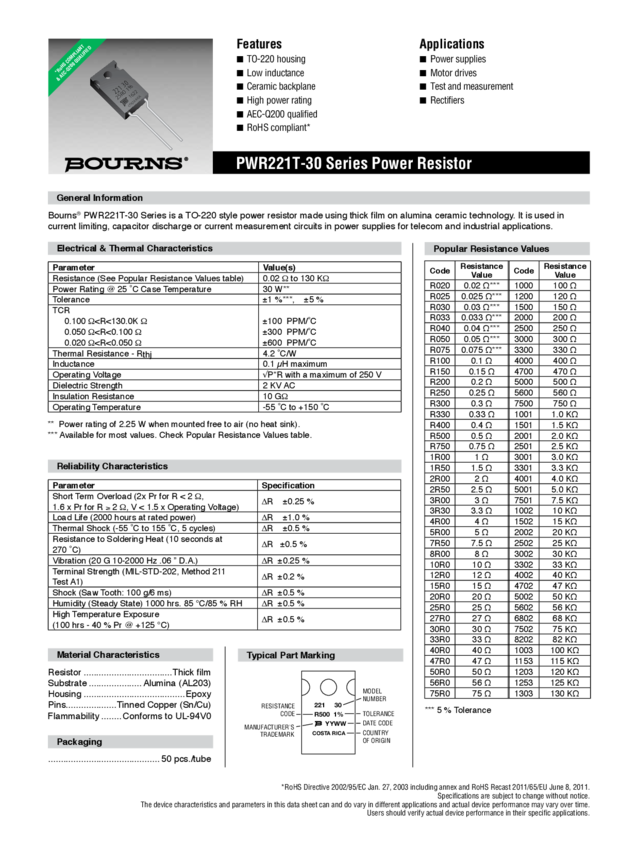 PWR221T-30-25R0J Res Thick Film 25 Ohm 5% 30W ±100ppm/°C Ceramic TO-220 Radial Thru-Hole Tub...