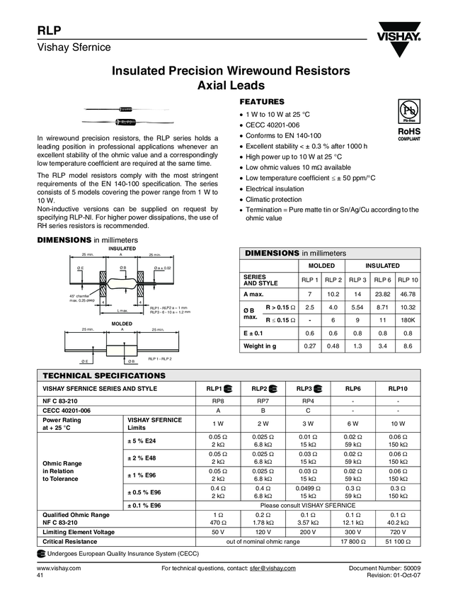 RLP01R0500JR15 Res Wirewound 0.05 Ohm 5% 1W ±100ppm/°C Molded AXL Thru-Hole T/R