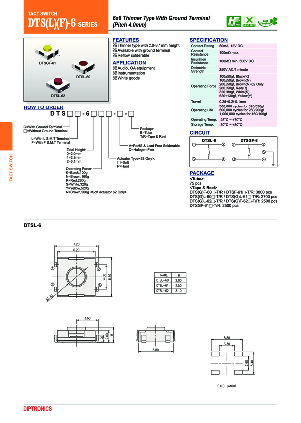 DTSGL-61K-V-B Switch Tactile N.O./N.C. SPST Round Button L-Bend 0.05A 12VDC 1000000Cycle...