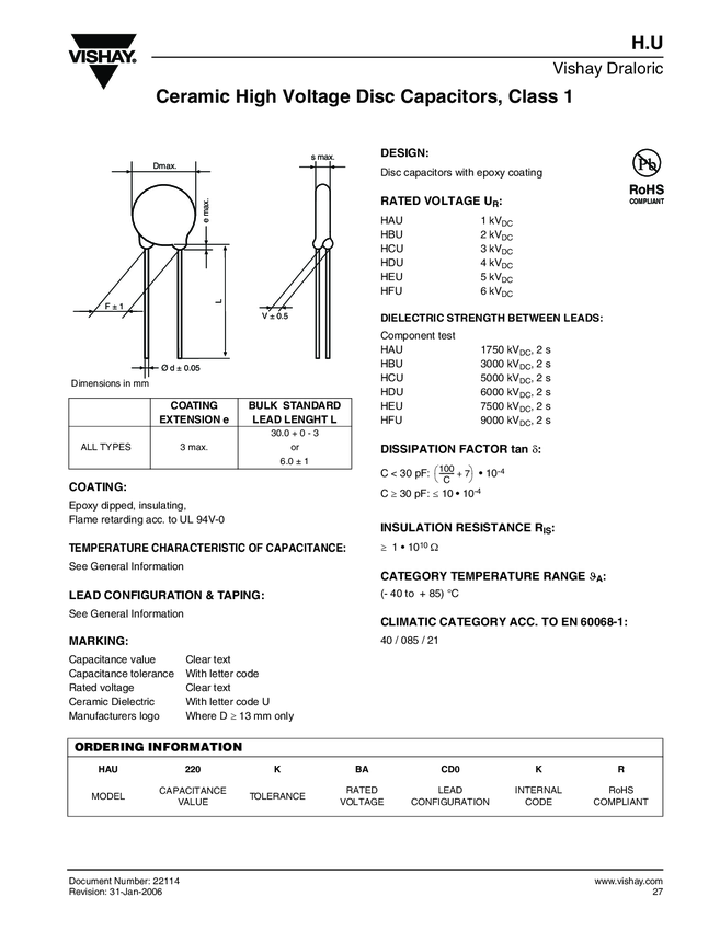HCU101KBCDF0KR Cap Ceramic 100pF 3000V N750 10% Radial 10 Bulk