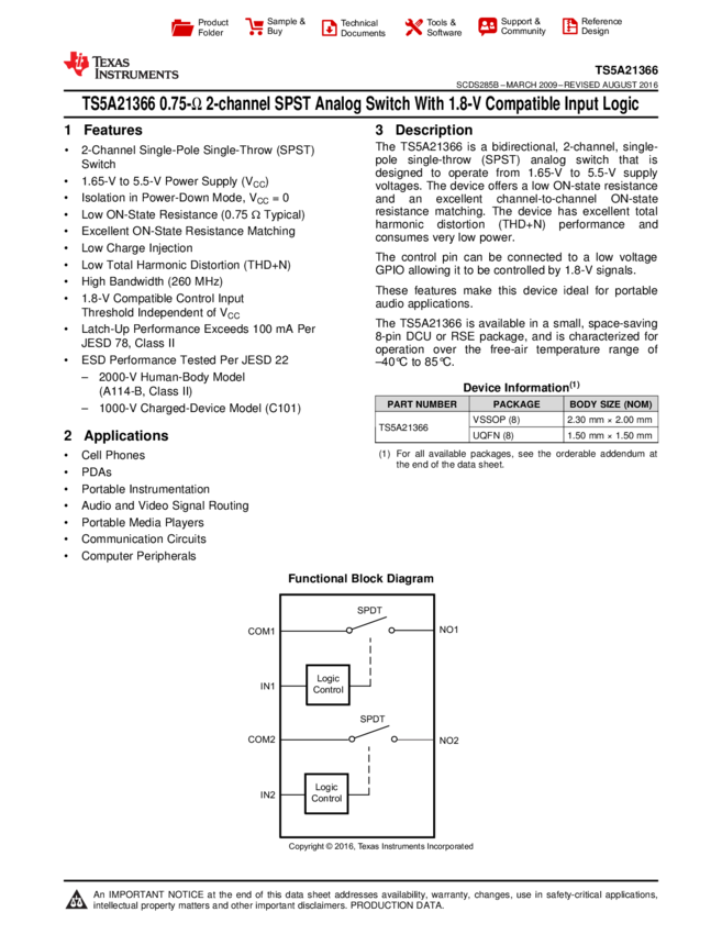 TS5A21366RSER Analog Switch Dual SPST 8-Pin UQFN T/R