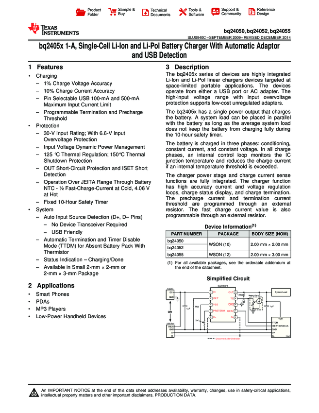 BQ24050DSQR Battery Charger Li-Ion 800mA 4.2V 10-Pin WSON EP T/R