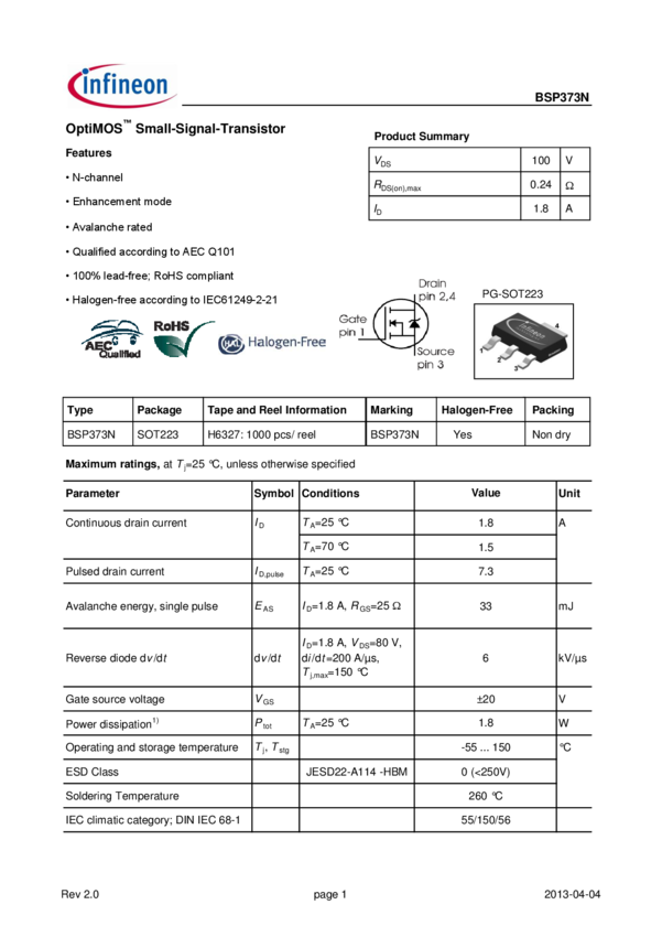 BSP373NH6327XTSA1 Trans MOSFET N-CH 100V 1.8A 4-Pin SOT-223 T/R