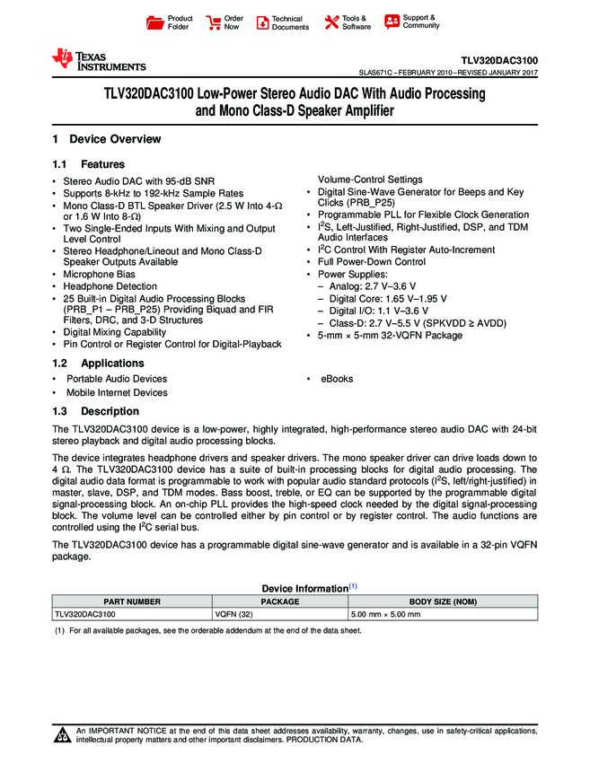 TLV320DAC3100IRHBR Stereo Audio DAC 32-Pin VQFN EP T/R