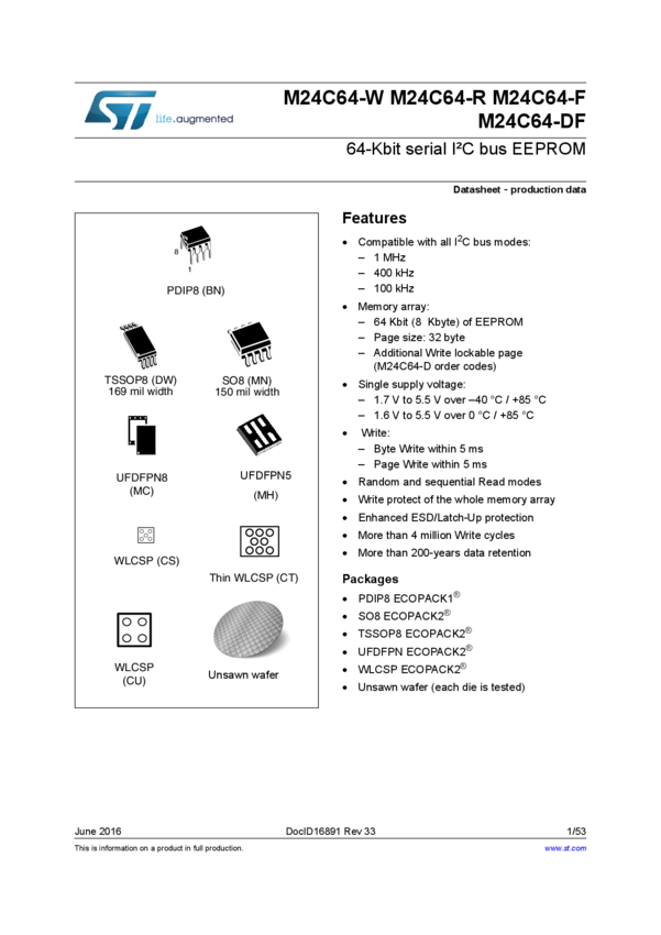 M24C64-FMC6TG EEPROM Serial-I2C 64K-bit 8K x 8 1.8V/2.5V/3.3V/5V 8-Pin UFDFPN EP T/R